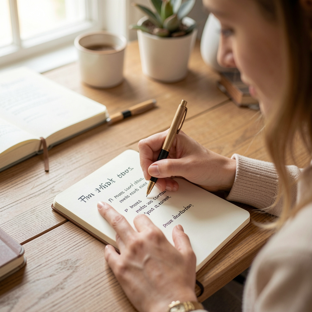 Escrever alguns pensamentos no papel é uma forma simples de aliviar a mente. Muitas vezes, a sensação de sobrecarga vem do acúmulo de pensamentos que ficam girando sem parar na cabeça.